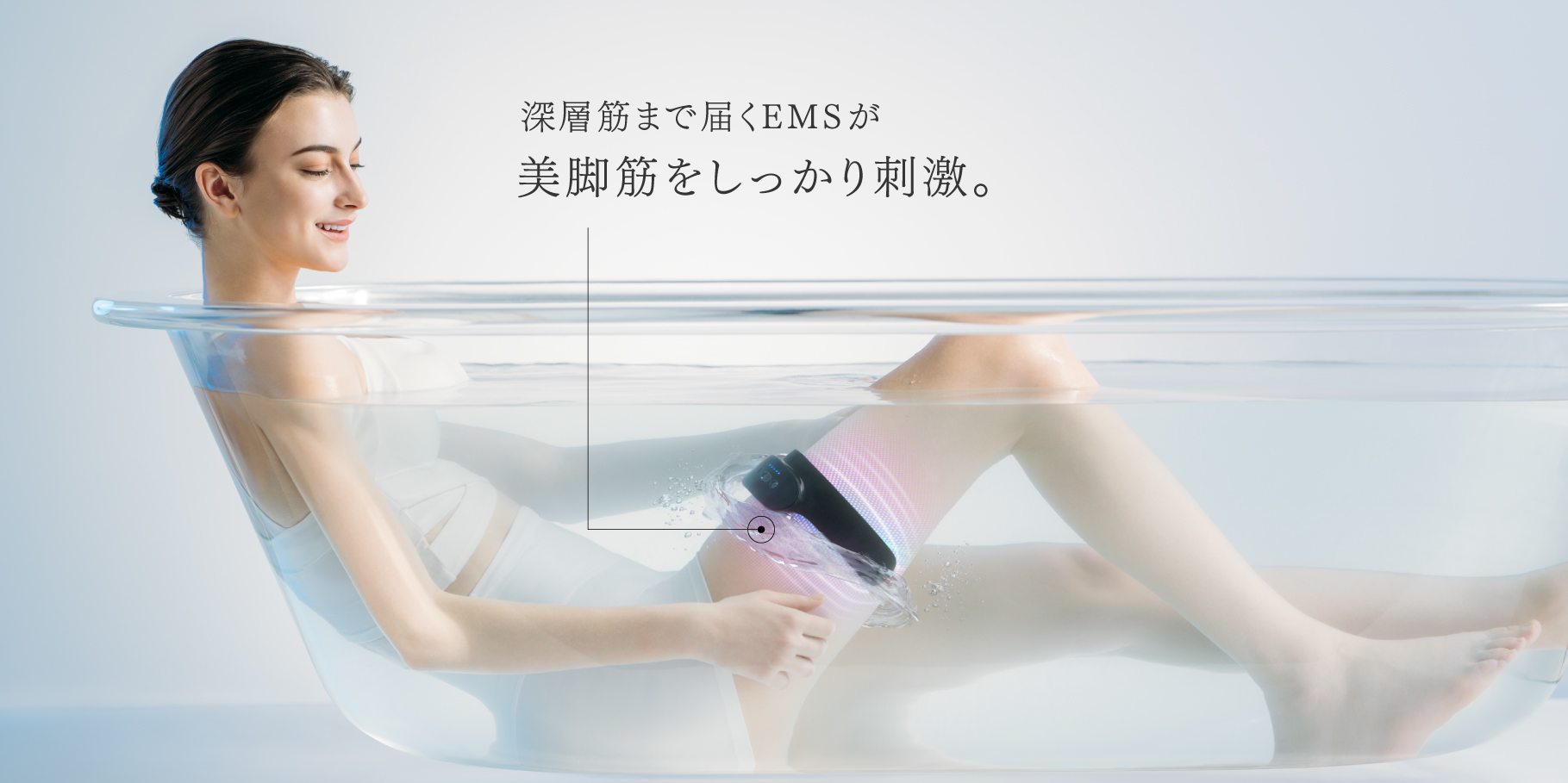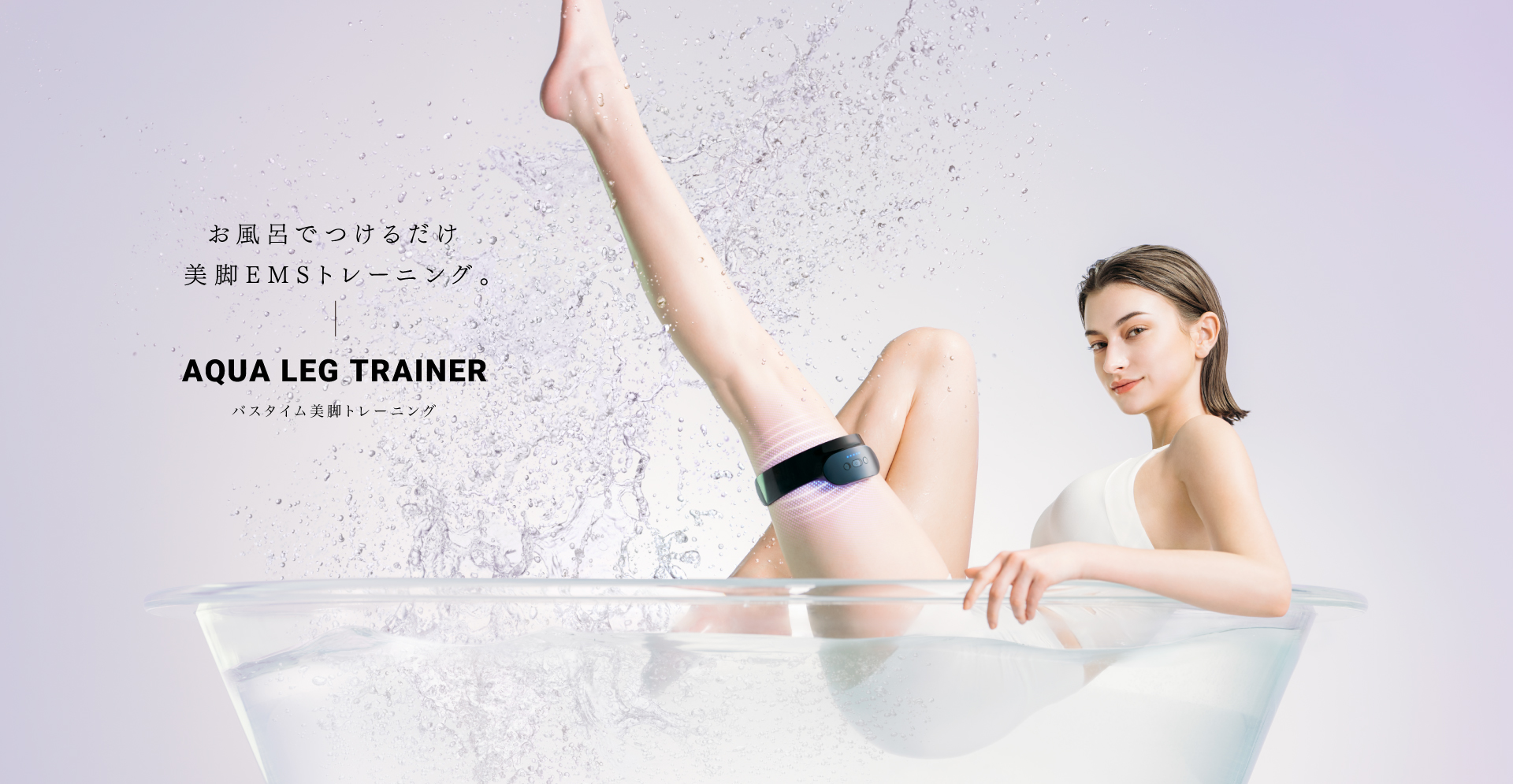 お風呂でEMSトレーニングができる人気商品「AQUAシリーズ」から新たに脚専用EMSトレーニングマシンが登場。パンツスタイルが似合わない、体型の崩れが気になるけれどハードな運動は難しいと悩む方が多い中、バスタイムに着目して開発した美脚マシン。お風呂だからこそ効果的かつ効率的に美脚筋を刺激し、独自のEMSプログラムと製品設計で、360°全方向から「ながら」トレーニングを叶えます。