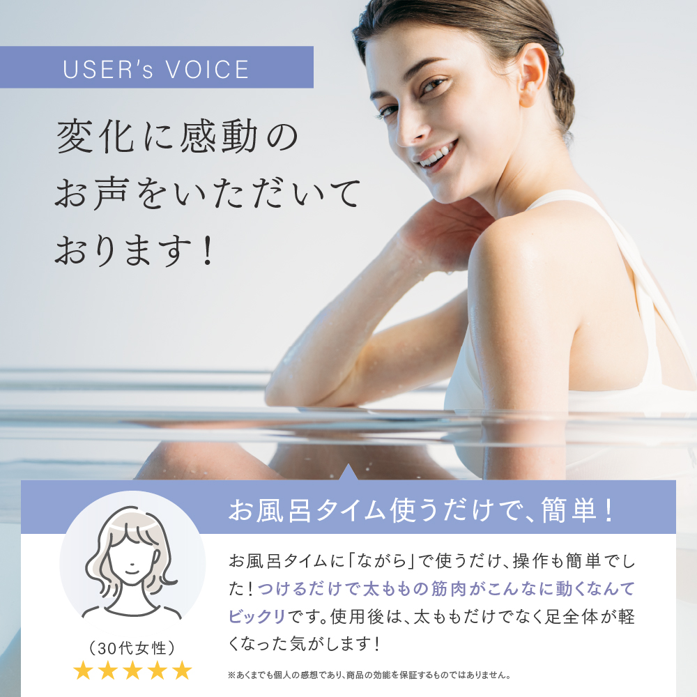 お風呂タイムに「ながら」で使うだけ、操作も簡単でした!つけるだけで太ももの筋肉がこんなに動くなんてビックリです。使用後は、太ももだけでなく足全体が軽くなった気がします!