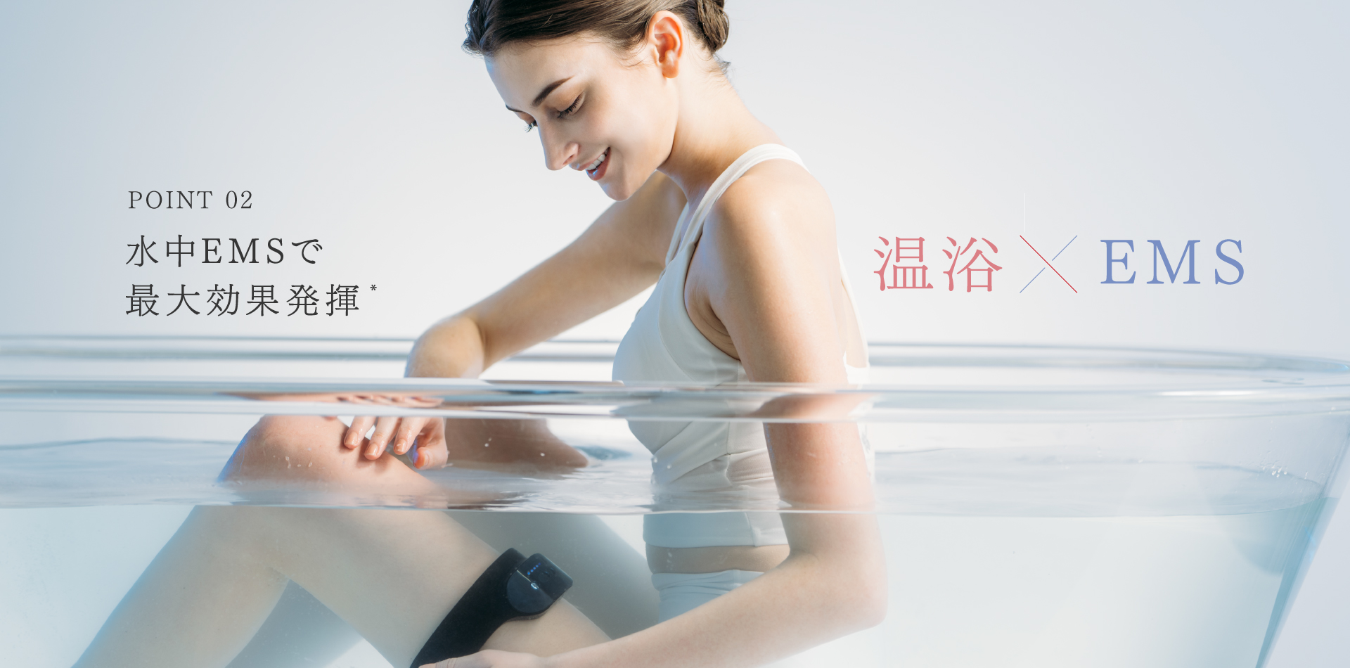 水分は電気を通しやすくする導電性が高いため、お風呂の中で使用する「AQUA LEG TRAINER」はEMSの力を最大限発揮*したホットトレーニングが可能です。
