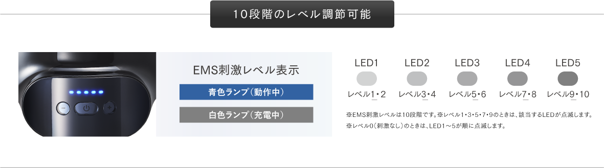 ※刺激レベルは、1~10から選択できます。※本体の通電部が肌に触れていない状態が10秒続くと、安全のため刺激レベルが0(刺激なし)に戻ります。