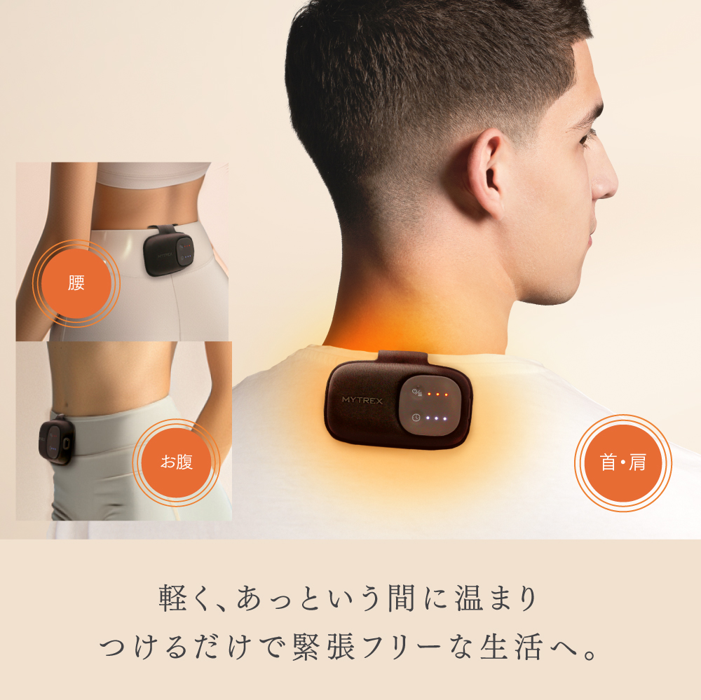独自の「ヒートループ技術」によって、さまざまな悩みの根本原因の一つである”体の緊張”にアプローチ。服に挟むだけであっという間に身体を温め、緊張フリーな生活へと導きます。