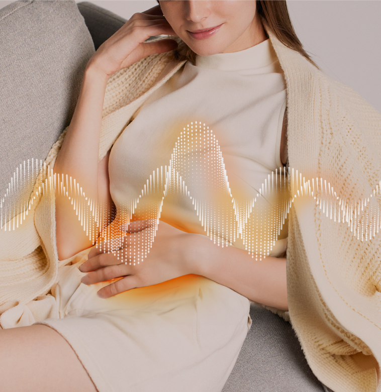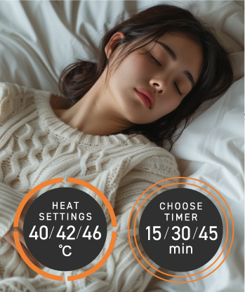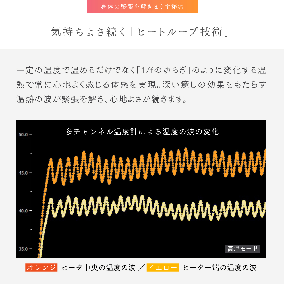 一定の温度で温めるだけでなく「1/fのゆらぎ」のように変化する温熱で常に心地よく感じる体感を実現。深い癒しの効果をもたらす温熱の波が緊張を解き、心地よさが続きます。
