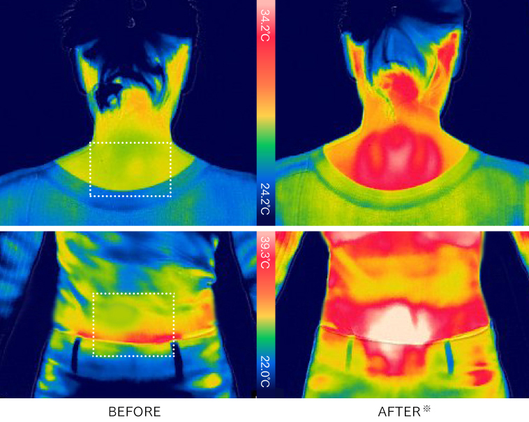 ※高温モード(46℃)で装着後にスイッチをONにした状態で高温(46℃)モードにて測定。画像左側は装着前、右側は装着後(首:40秒、腹部:60秒)の被験者の上半身の表面温度をサーモグラフィにて撮影。自社調べ。