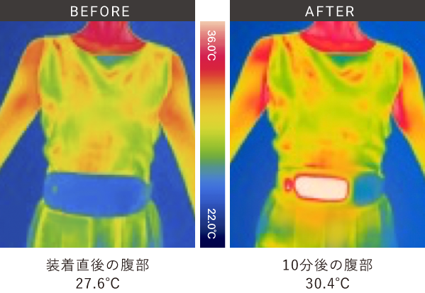 ※CORE WARMER中温モード(55~58℃)測定環境下にて試料を十分体に馴染ませ、装着後にスイッチをONにした状態で測定。