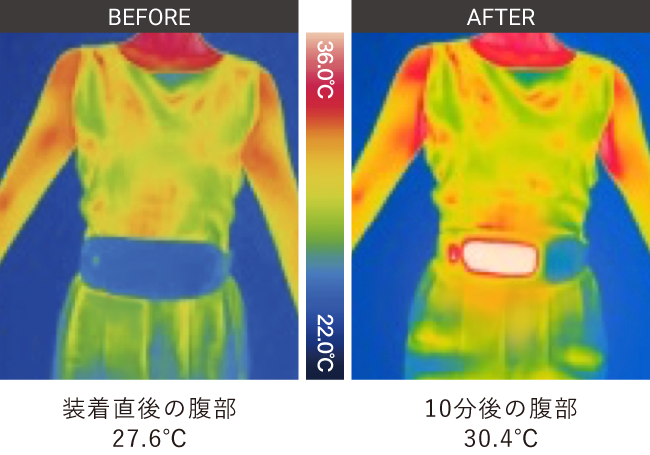 画像左側は装着直後、右側は装着10分後の被験者の上半身の表面温度をサーモグラフィにて撮影。測定は第三者機関にて行った。