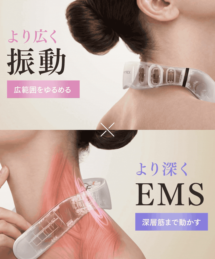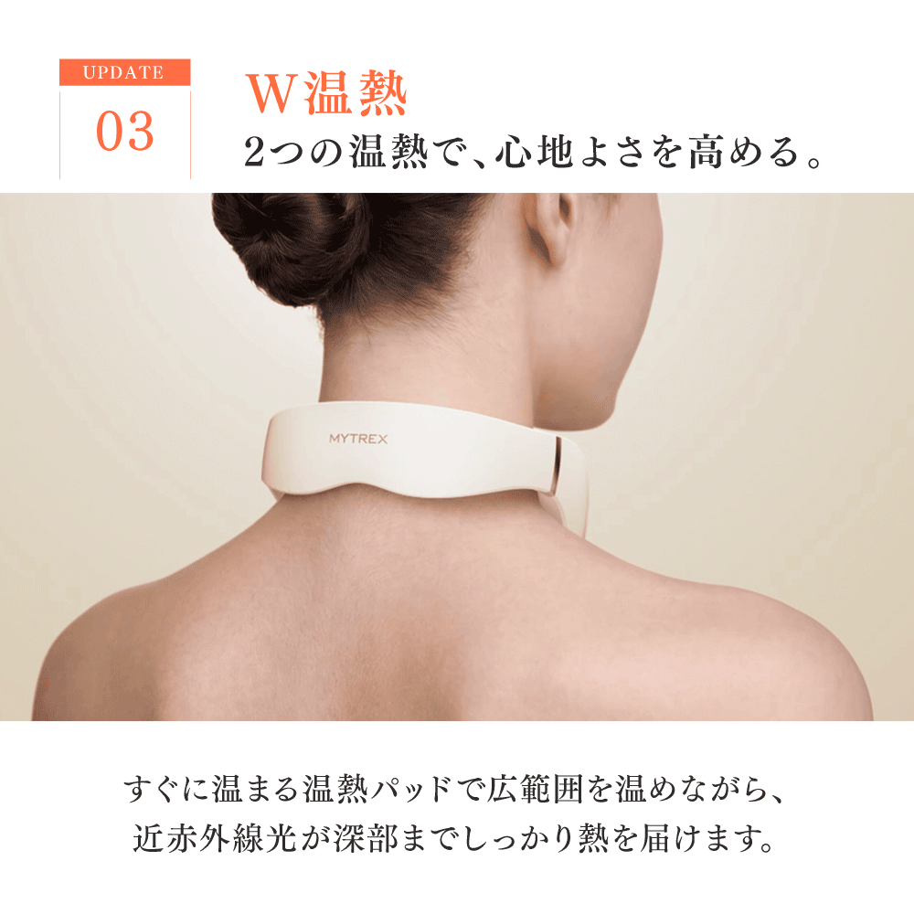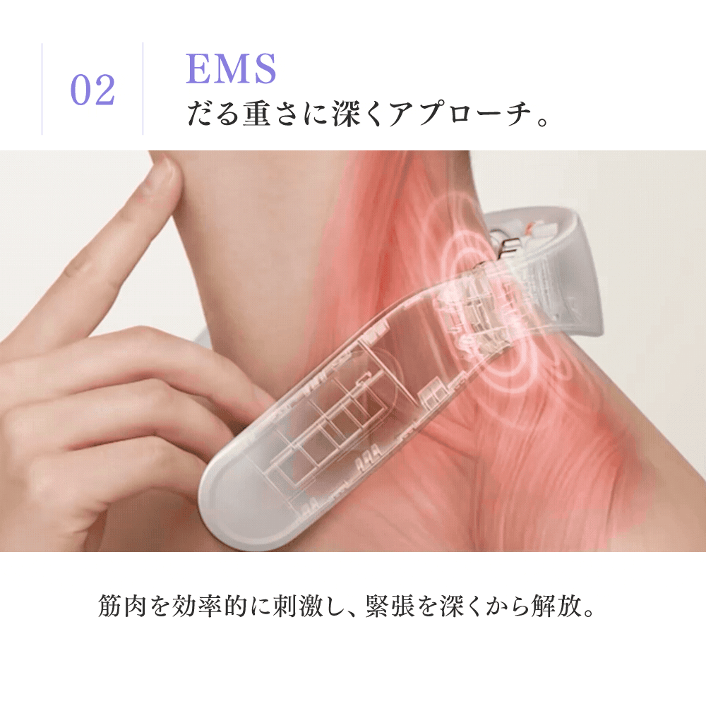 人気のHEAT NECKシリーズが進化を遂げました。新搭載の振動機能が、タッピングするように筋肉を刺激。さらに、EMSでこわばった筋肉をしっかりと動かします。近赤外線と温熱パッドのダブルの温もりで、つらい首や肩の悩みからじんわりと解放。「もっとケアの実感や気持ちよさがほしい」という方におすすめの、ハイブリッドケアモデルです。