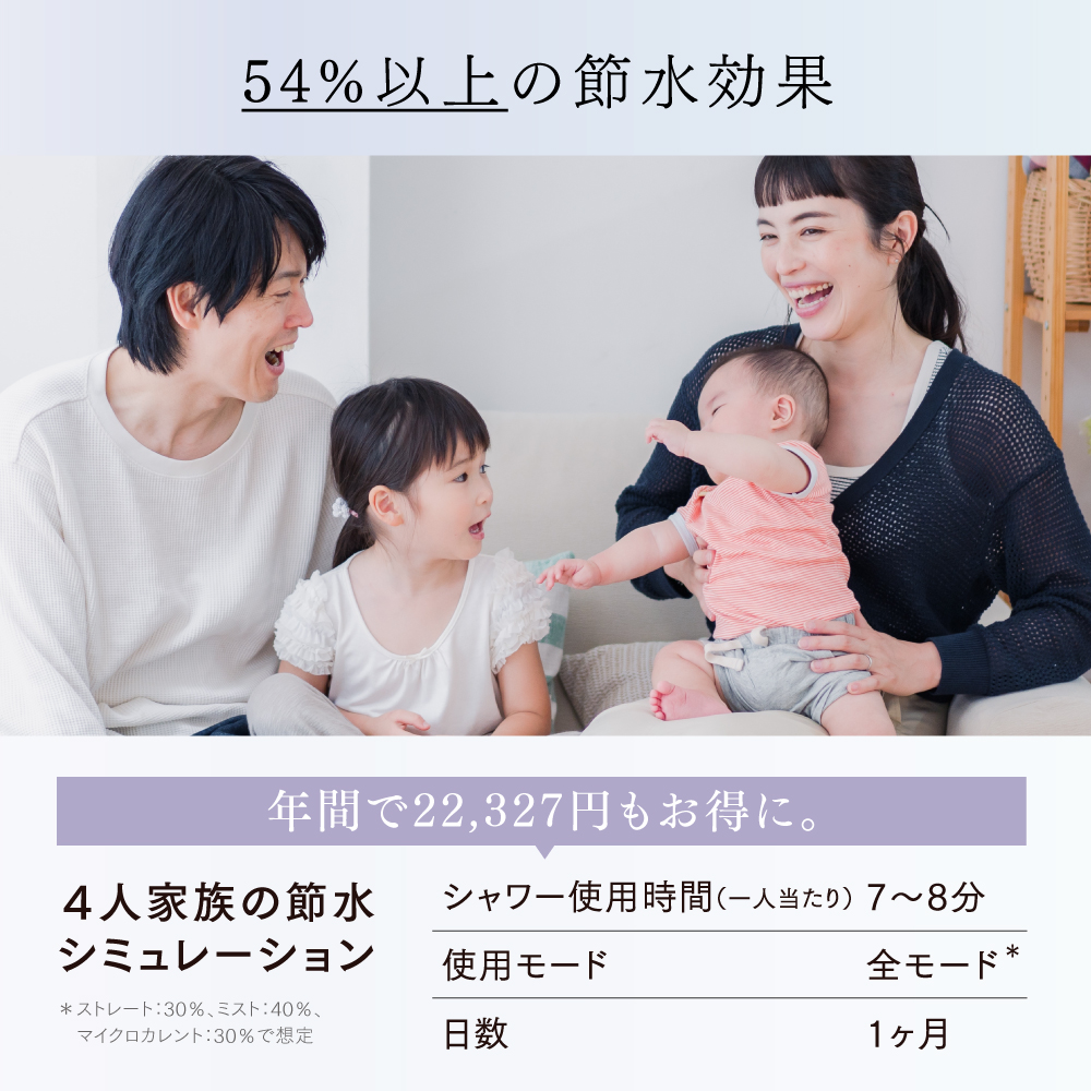 数年かけて開発された独自の技術により、シャワーヘッド本体からマイクロカレントを生み出す『水力発電』を搭載。電気を発するにも関わらず《充電・電気代》無しで自宅の水が、浴びるだけで美顔器と同じ効果を得られる「肌育」シャワーに。