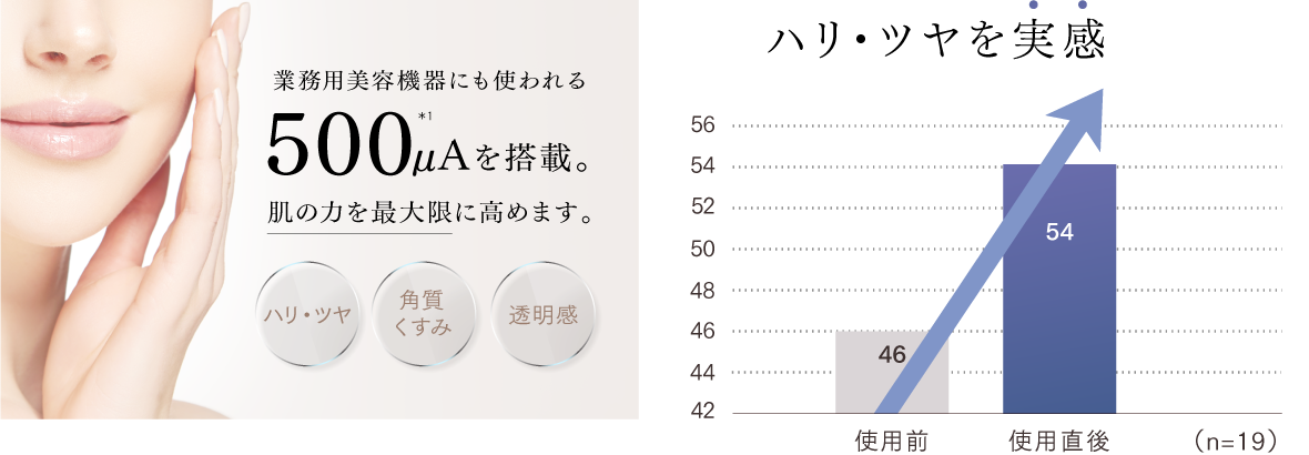 エステや美顔器、医療用治療器でも使用される、刺激を感じないほど微弱な電流のこと。微弱電流によって肌の内側から刺激し、ハリや弾力感、エイジングケア*を叶えます。
