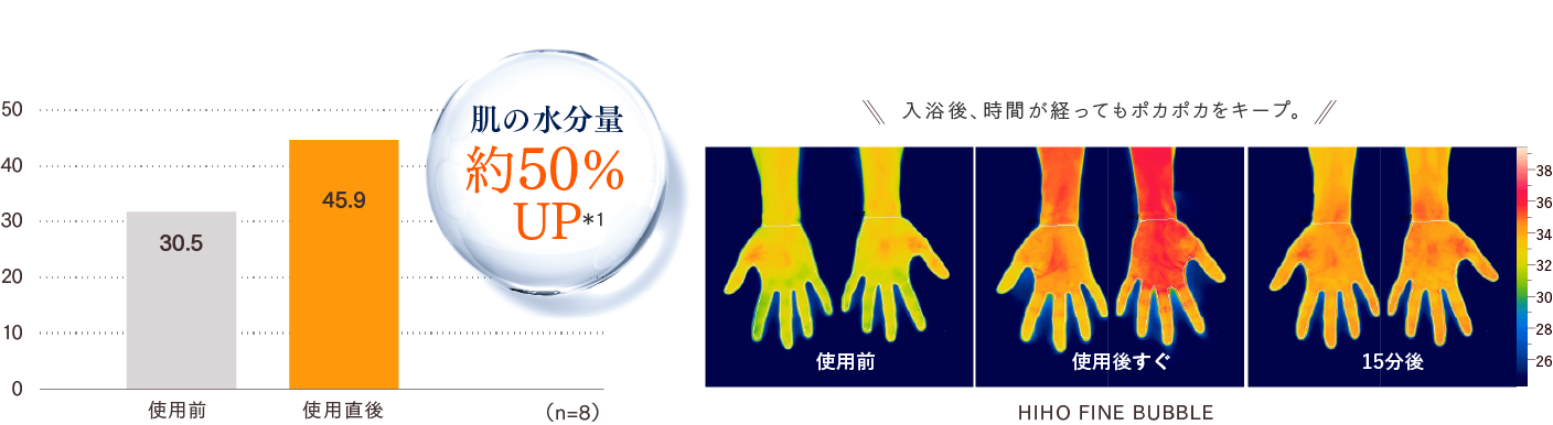 ※1:【皮膚水分量測定】「HIHOミストモード」40度設定のお湯で検証。手首から肘内側屈曲部を結んだ直線上の左前腕部分に10分間かけた場合。被験者8名で測定。HIHO FINE BUBBLE+(MT-HFBP22SL)の試験内容含む。 ※2:【体表面温度の変化(サーモグラフィ)】40℃の水流が出るように切り替えたシャワーヘッドを容器に入れ、右手(手首から指先)をつけて、使用前・使用直後の体表面温℃変化の評価(サーモグラフィ)を測定。被験者6名(入浴直後・15分後)の体温の平均測定温度を、他社製品のお湯と「HIHOストレートモード」40度設定のお湯で検証。HIHO FINE BUBBLE(MT-HFB21SL)の試験内容含む。 ※いずれも第三者試験ラボにて測定。使用感・効果には個人差があります。