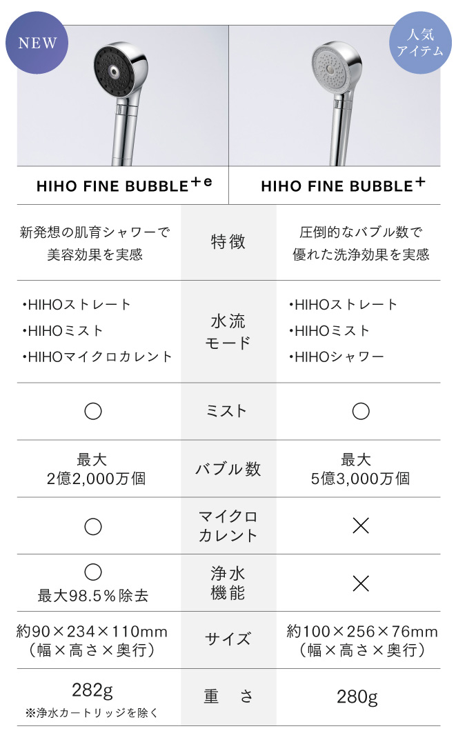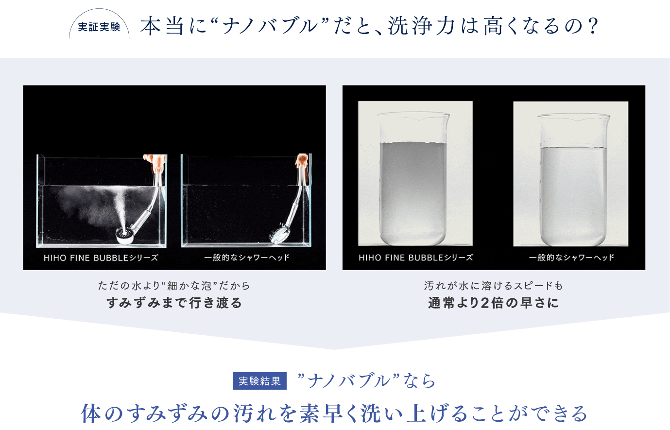 ※1:【洗浄力検証(ファンデーション)】前腕内側部(肘内側屈曲部から10cmの部位)にファンデーションを塗布し、「HIHOミストモード」を20cm離した状態で使用。40℃の湯で10秒間洗い流した場合。HIHO FINE BUBBLE+(MT-HFBP22SL)の試験内容含む。 ※2:【洗浄力検証(頭皮スコープ)】頭を洗わない状態で測定。40℃の湯で5分間、「HIHOシャワーモード」を5cm離した状態で頭部を洗い流し、使用前使用後マイクロスコープで撮影。※いずれも使用感・効果には個人差があります。HIHO FINE BUBBLE(MT-HFB21SL)の試験内容含む。