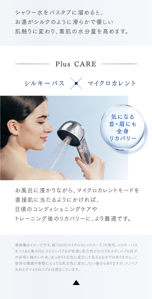 *1:マイクロカレントモードにおいて。シャワーヘッドが身体に近いほど電流は大きくなります。*2:【被験者】男女19名【試験内容】腕を石鹸で洗浄後、23.0±2℃の室内で15分馴化した。HIHO FINE BUBBLE+eを「HIHOマイクロカレントモード」(温度38.0±2℃、流量8±1L/min)で前腕部内側に40秒間あて、5分後に肌弾力値を測定した。(2023年11月1日自社調べ)