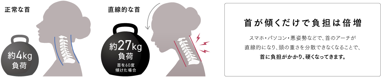 真っ直ぐになった首のアーチを自然なアーチ状へとサポートすることで、首への負担を軽減し、首まわりをラクにします。