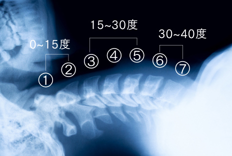 頸椎の牽引においては、頸椎が第一から第七までの7個の骨で構成されているため、全ての頚椎に正しくアプローチするには、40度以上牽引することが重要です。