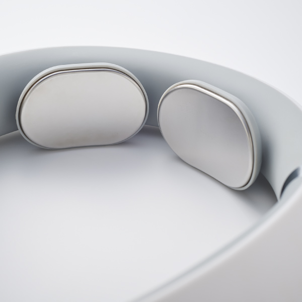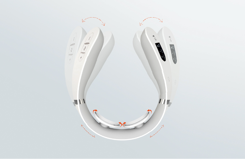 人間工学に基づき、頸椎の曲線に合わせて傾斜がつくように計算された“段階厚み設計”を採用。先端に向けて段階的に厚みを持たせ、重心を下にすることで装着時の隙間を減らしました。動いてもズレにくく、本体の重量も本1冊より軽いわずか約166gと、着けていることを忘れるような快適さです。