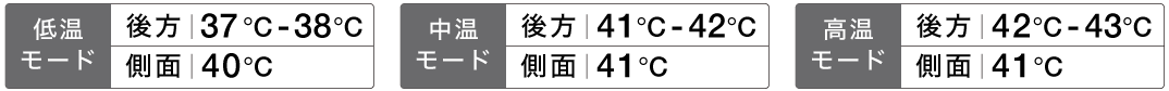【温度設定について】 安全のため側面温感パッドは、[低温モード40℃]、[中温・高温モード41℃]の設定です。
