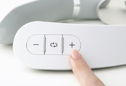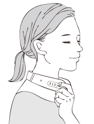 首に(直接肌に)装着し、右側の電源・加熱切替ボタンを短く1度押して、電源をオンにする。