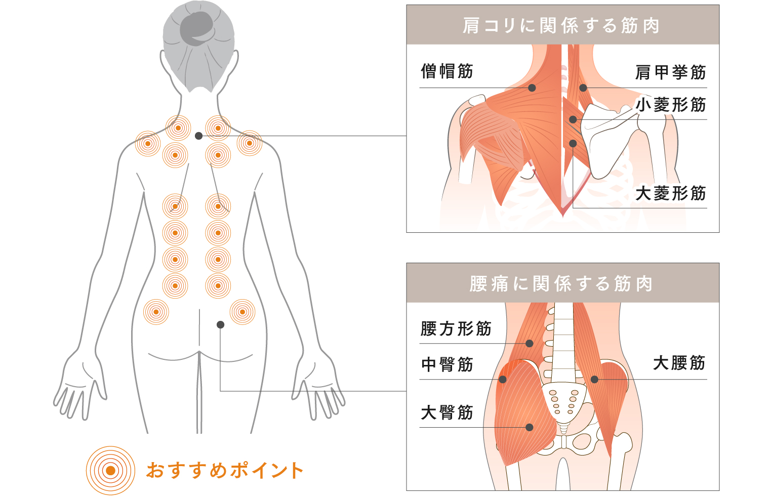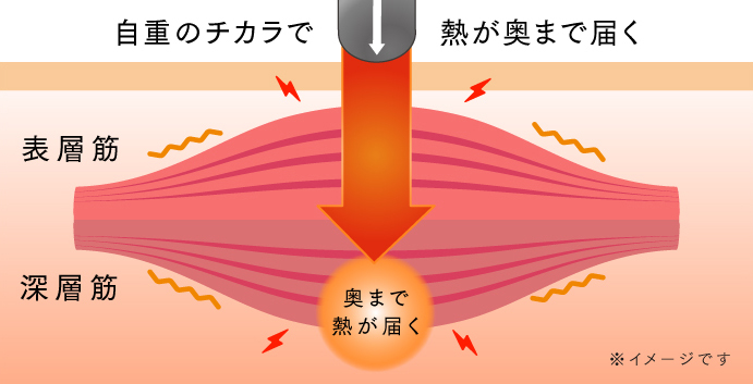 筋肉を暖めながらほぐすことで、筋肉痛や神経痛の痛みを和らげます。また冷えからくる、コリや痛みにも温熱がピンポイントに刺激し緩和します。