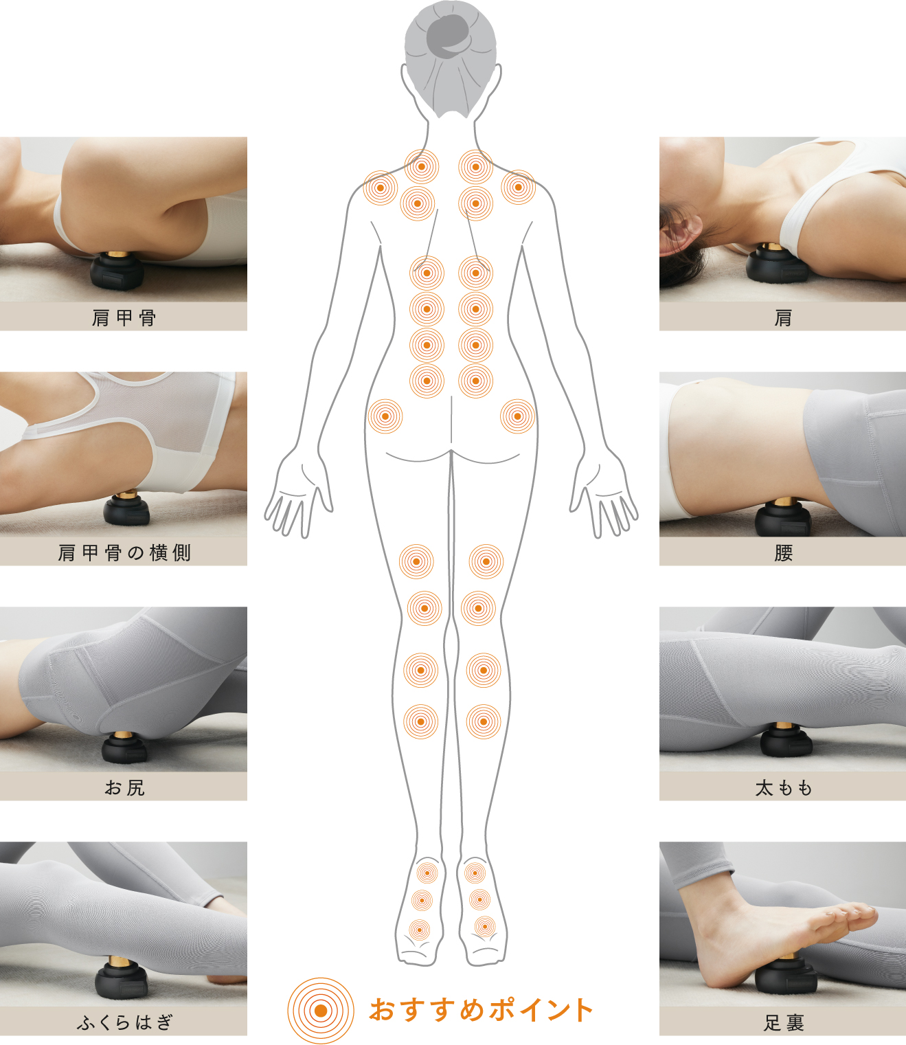 球頭に適度な反発力のスプリングを内蔵。球頭がバネで沈み込み、自重で7mmまで高さ調整可能なので、ベットやソファなど柔らかい所でも場所を選ばず、効果的にコリを捉えます。
