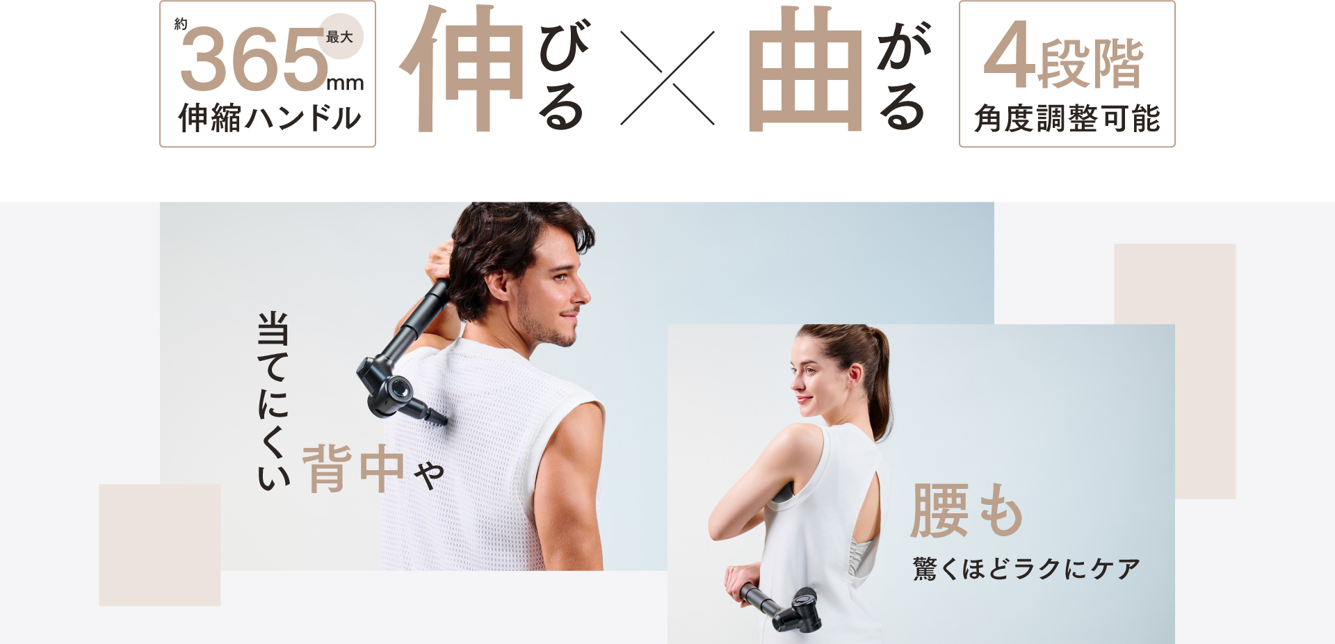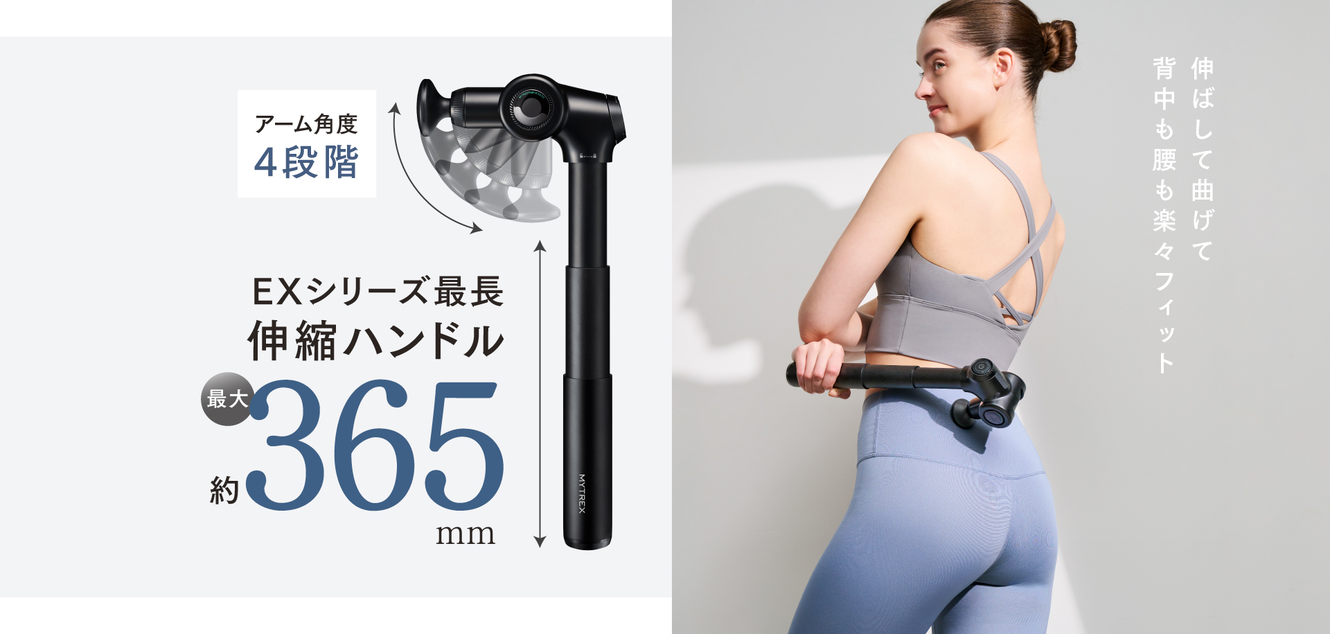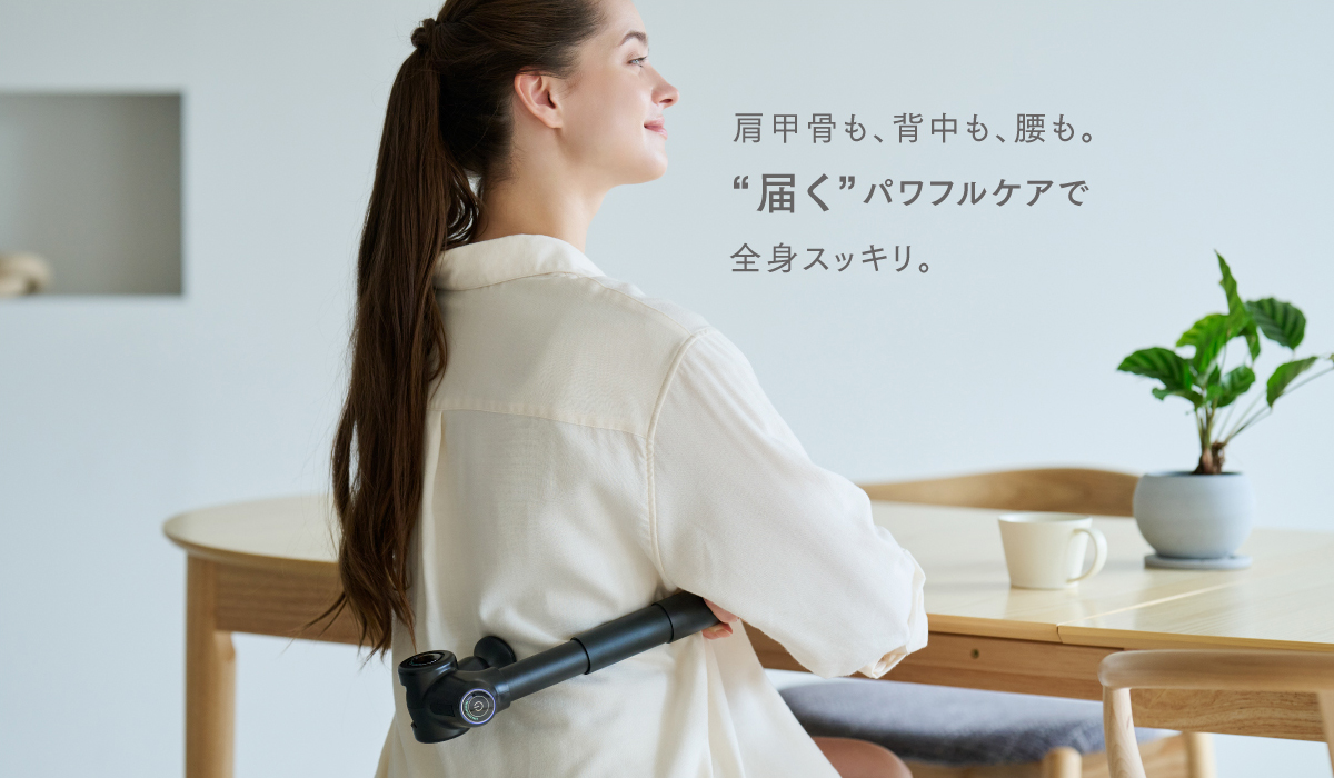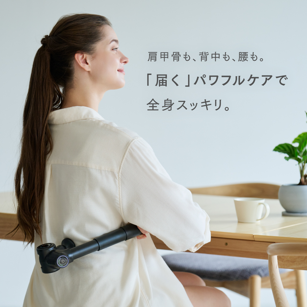 「REBIVE EX」シリーズから日々のボディケア専用に進化した「REBIVE EX FIT」が誕生。シリーズ最長約365mmの伸縮ハンドルと4段階に調整可能なアームを備えたハンディガンなので、1人ではケアしづらい背中や腰も簡単フィット。自由自在な形状でデスクワークや運動不足で固まりがちな背中にも最適。日々のケアに寄り添ったボディケアを叶えます。