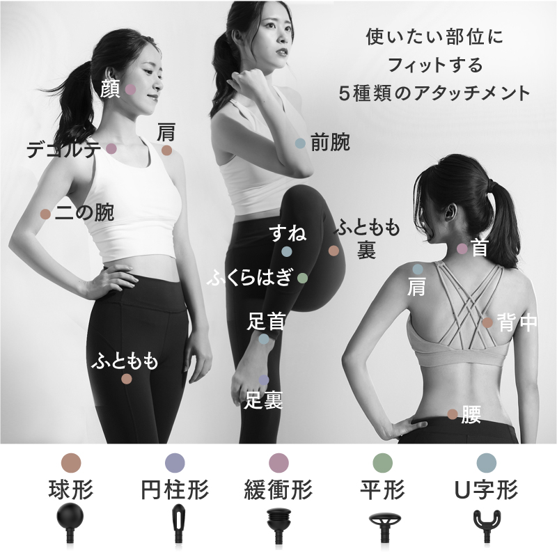 材質や形が異なる5種類のアタッチメントで、頬から足まであらゆる部位にご使用いただけます。