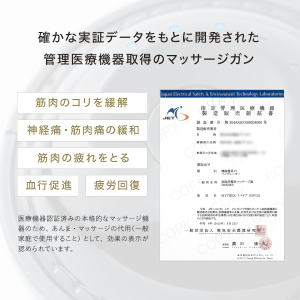医療機器認証済みの本格的なマッサージ機器のため、あんま・マッサージの代用(一般家庭で使用すること)として、効果の表示が認められています。
