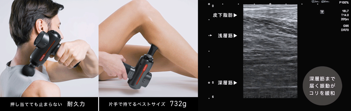 片手で使える約732gのコンパクトさと、毎分最大3100回のパワフル振動。深層筋までしっかりアプローチし、コリや痛みを緩和します。押し当てる強さでパワーが変化するので、自分好みに調整可能です。