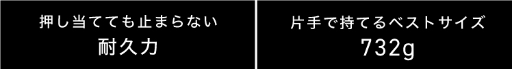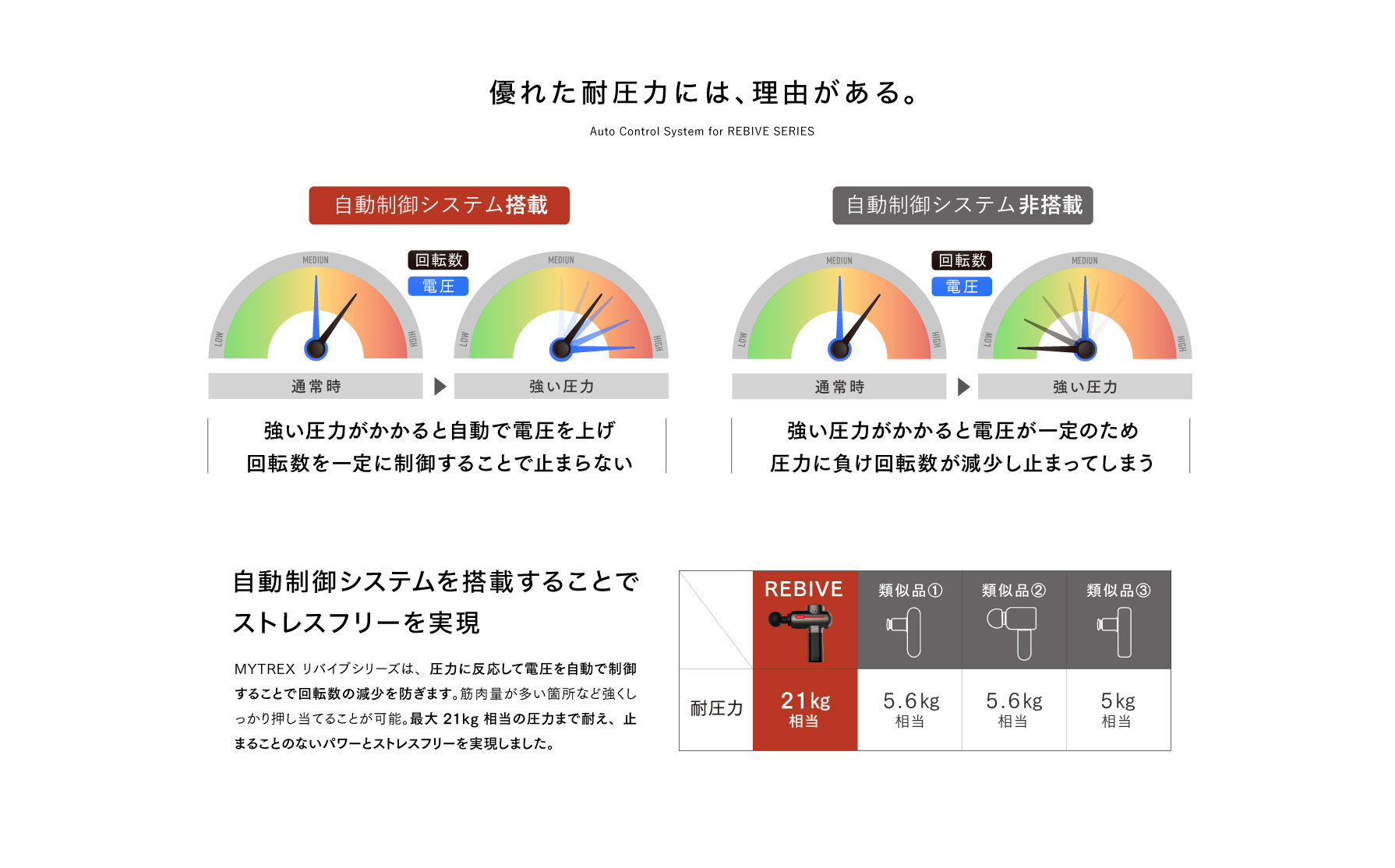 MYTREXリバイブシリーズは、圧力に反応して電圧を自動で制御することで回転数の減少を防ぎます。筋肉量が多い箇所など強くしっかり押し当てることが可能。21kgの圧力まで耐える、止まることのないパワーとストレスフリーを実現しました。