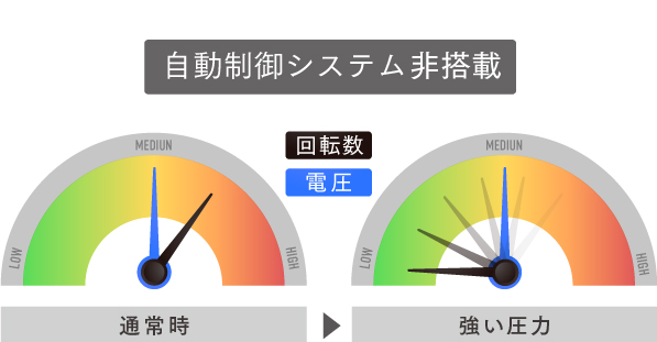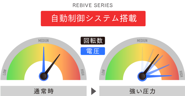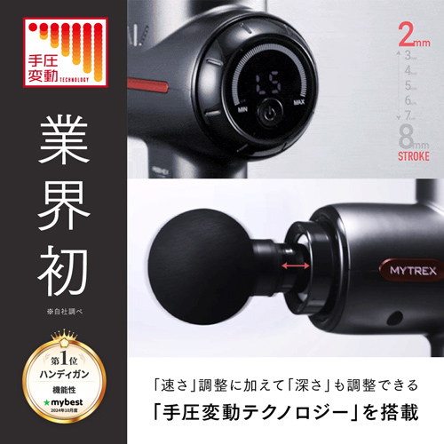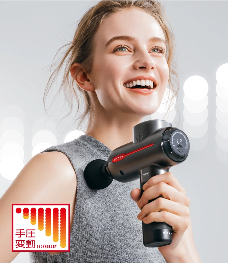 MYTREXリバイブシリーズは、圧力に反応して電圧を自動で制御することで回転数の減少を防ぎます。筋肉量が多い箇所など強くしっかり押し当てることが可能。最大20kg相当の圧力まで耐え、止まることのないパワーとストレスフリーを実現しました。