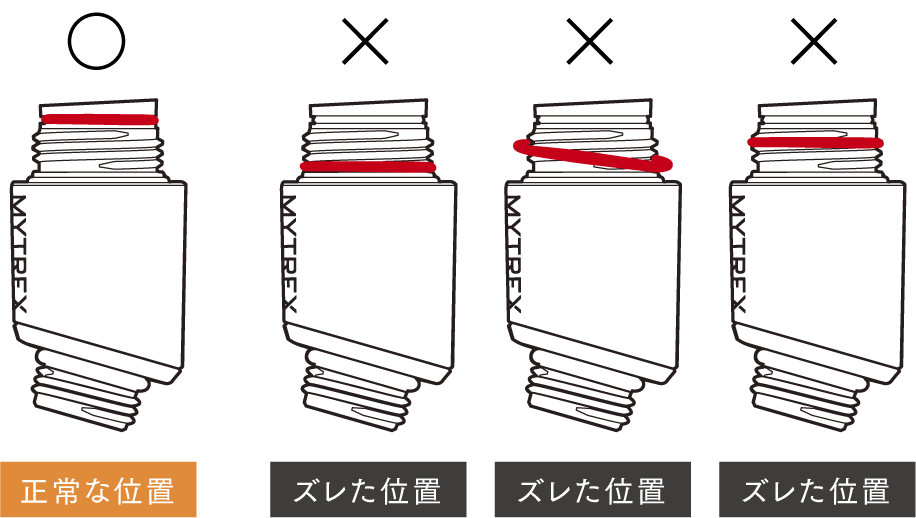 ゴムパッキン(赤)は外さないでください。定位置から外れた箇所にある場合、水漏れの原因となりますので本体取り付けの際はゴムパッキン(赤)が正しい位置にあるか確認してから装着してください。万一、ゴムパッキン(赤)が切れた場合などはカスタマーサポートまでお問い合わせください。