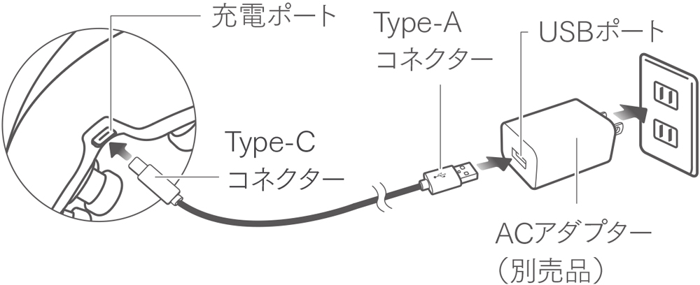 本体底面の充電ポートに、付属の充電用USBコードのType-Cコネクター側を接続し、USBコードのType-Aコネクター側をお手持ちのACアダプター等のUSBポートに接続する。