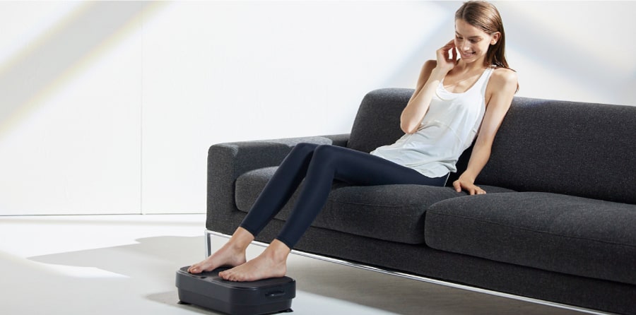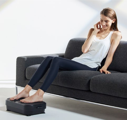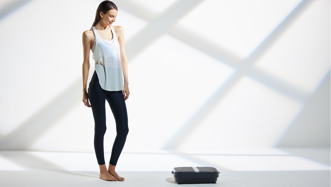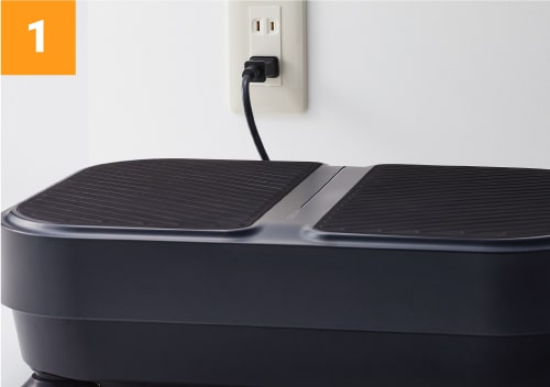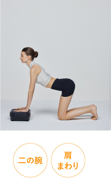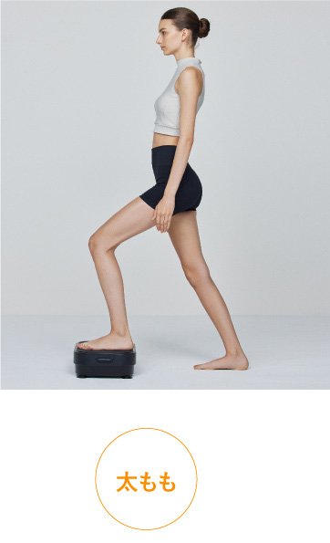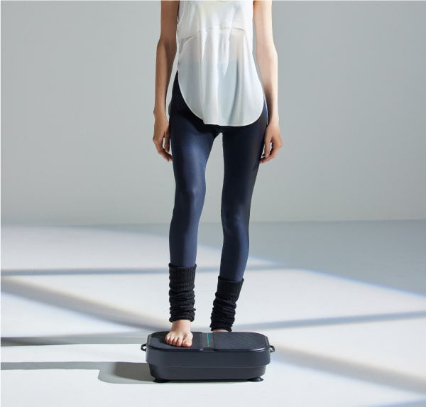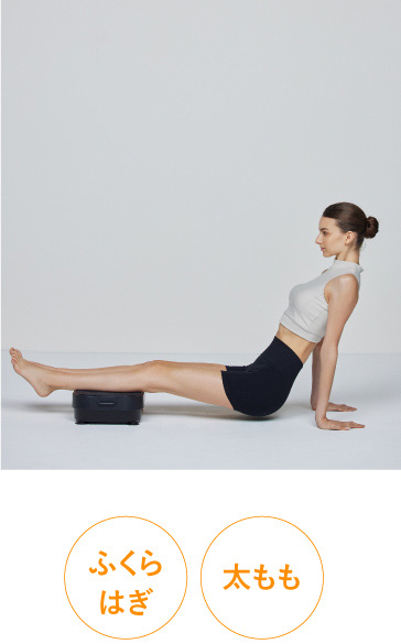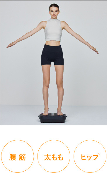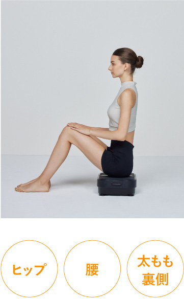 骨盤を立てて背筋を伸ばし、本体に座ります。腹筋を締めるように意識します。振動スピードは、低いレベルでおこなってください。
