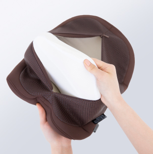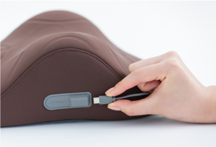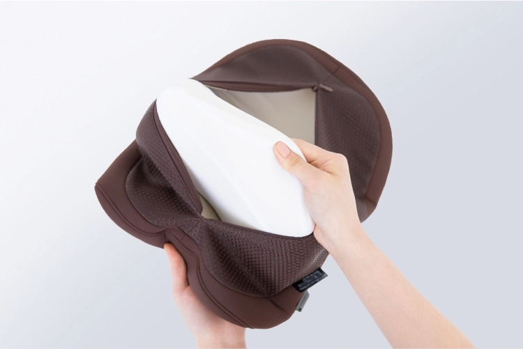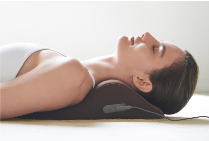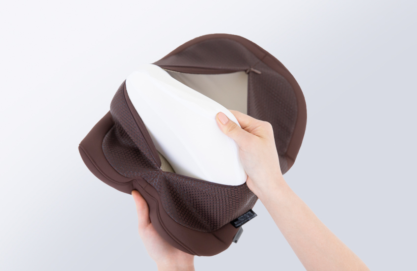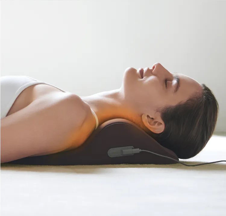 首・肩を効果的に休ませる。たどり着いたのは癒しの曲線美。独自に開発した流線型の形状が、首・肩にフィット。首から肩のカーブに優しく沿うよう設計された独自の流線形状と、首元を自然に支え続ける内部構造。じんわりと温めながら、頭の重みで気持ちよく働きかけます。