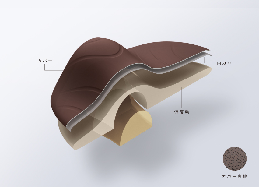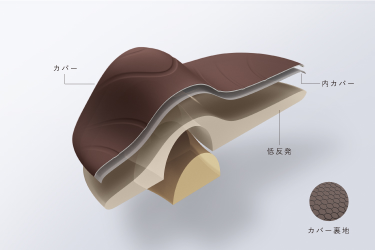 低反発素材と高反発素材を適材適所に使い分けた多重構造。使い分けることでへたれず長持ちできる作りに。さらに取り外しのできるカバーには、裏地にシリコン製の滑り止めを採用。使用中のズレを抑えます。